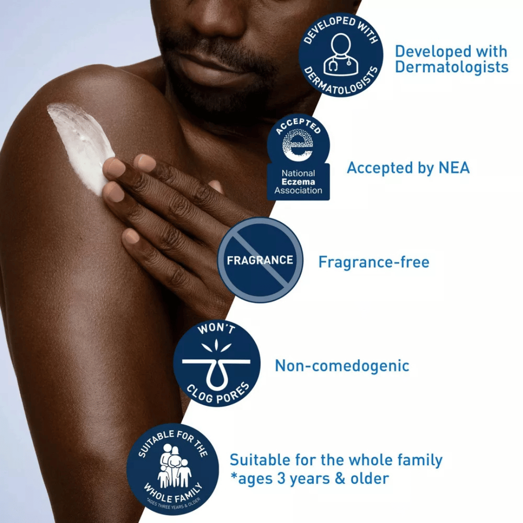 CeraVe Moisturizing Cream for Face and Body, developed with dermatologists, delivers 24-hour hydration while helping to restore the skin’s protective barrier. Formulated with three essential ceramides (1, 3, 6-II) and hyaluronic acid, it helps lock in moisture and strengthen the skin barrier. The cream features patented MVE Technology for controlled, long-lasting hydration throughout the day. It's non-comedogenic, fragrance-free, and oil-free, making it ideal for dry, sensitive, or eczema-prone skin.