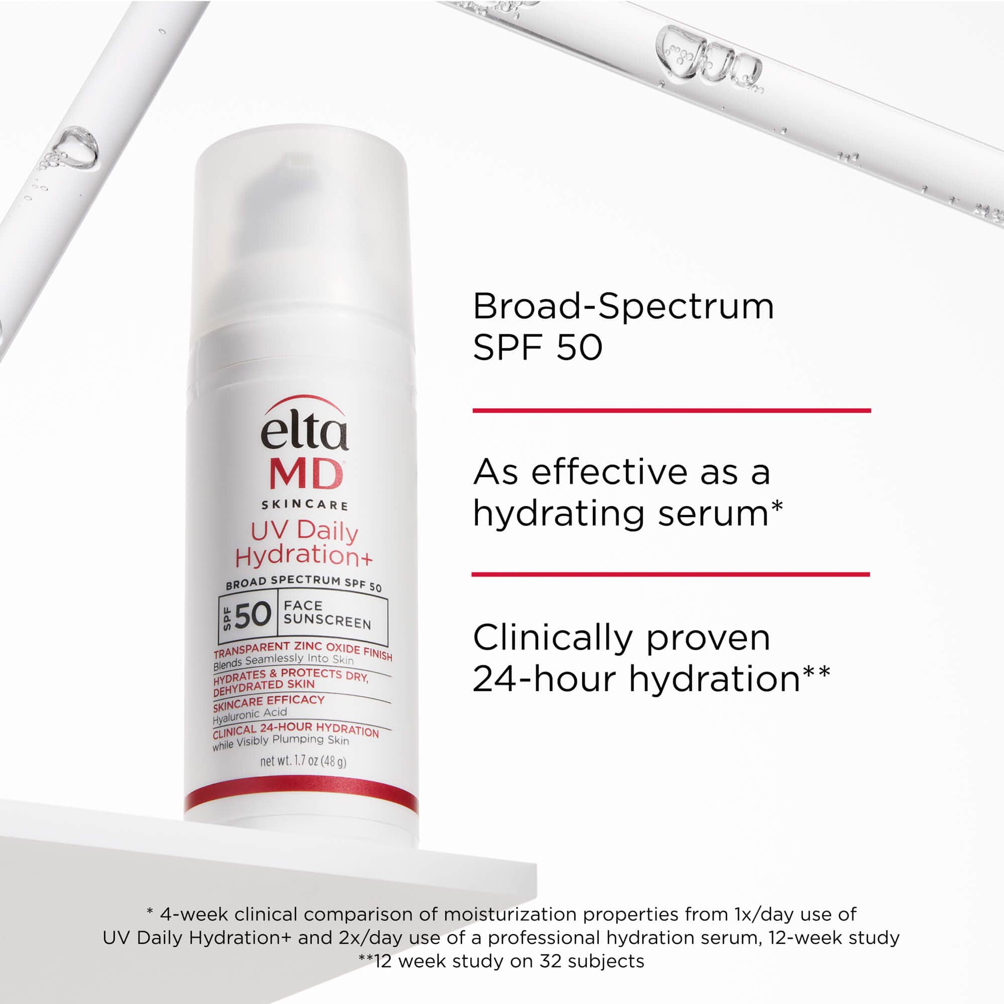 EltaMD UV Daily Hydration+ SPF 50 is a lightweight, dermatologist-developed sunscreen that delivers advanced sun protection and long-lasting hydration in one step. Formulated with transparent zinc oxide for broad-spectrum UVA/UVB defense, it shields your skin from sun damage while hyaluronic acid and squalane lock in moisture for a soft, smooth finish.