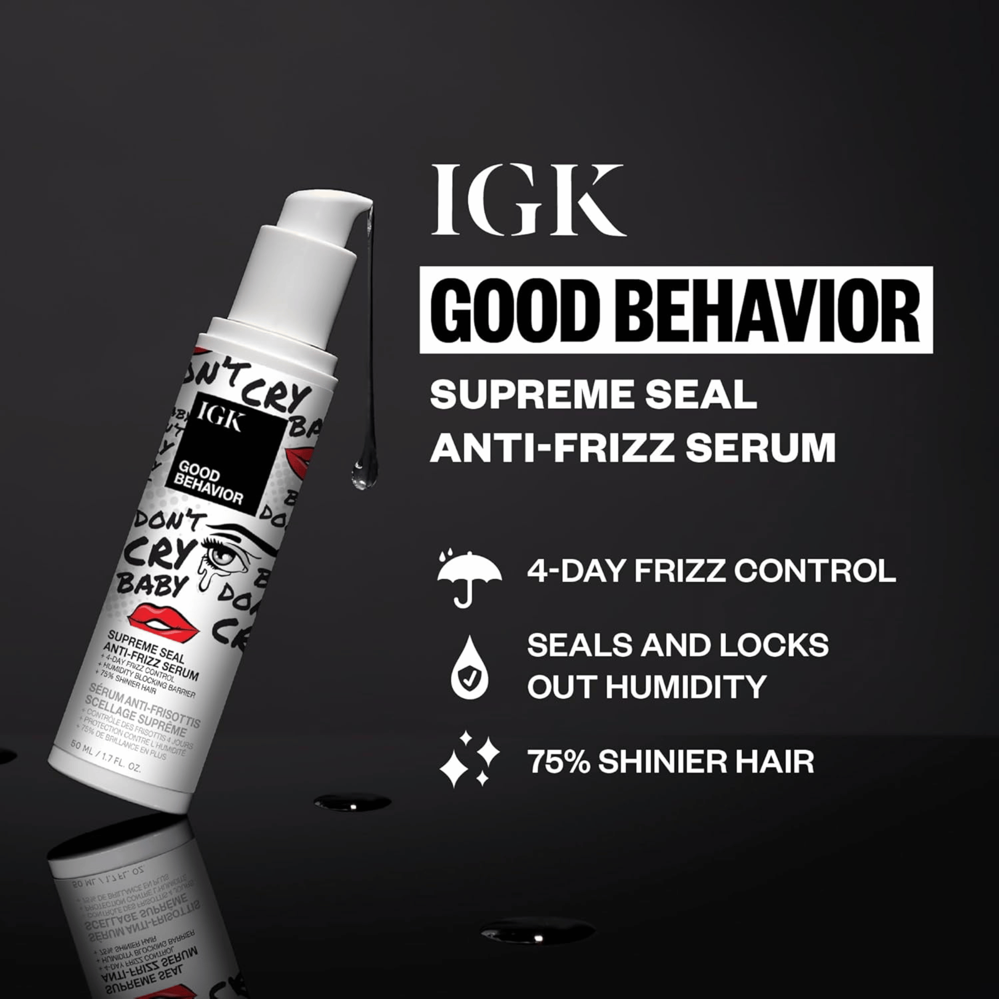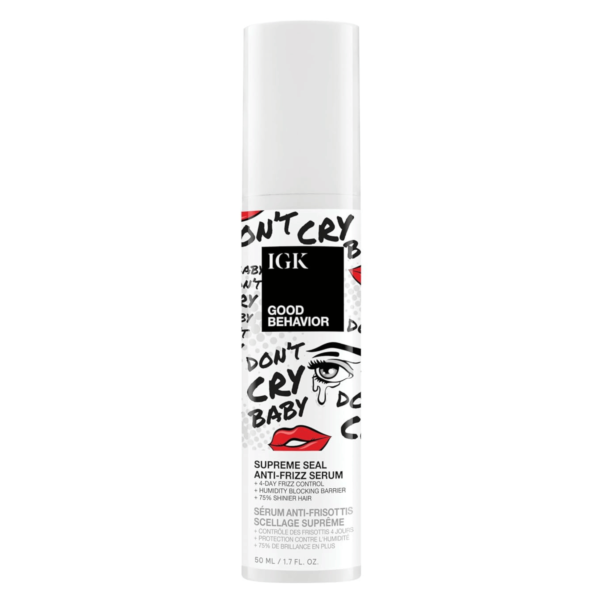 IGK's high-shine Good Behavior Supreme Seal Anti-Frizz Serum provides frizz control for 4 days. This concentrated formula imparts a mirror-like effect, smooths the hair, contains UV protection and tames flyaways, even in high humidity.