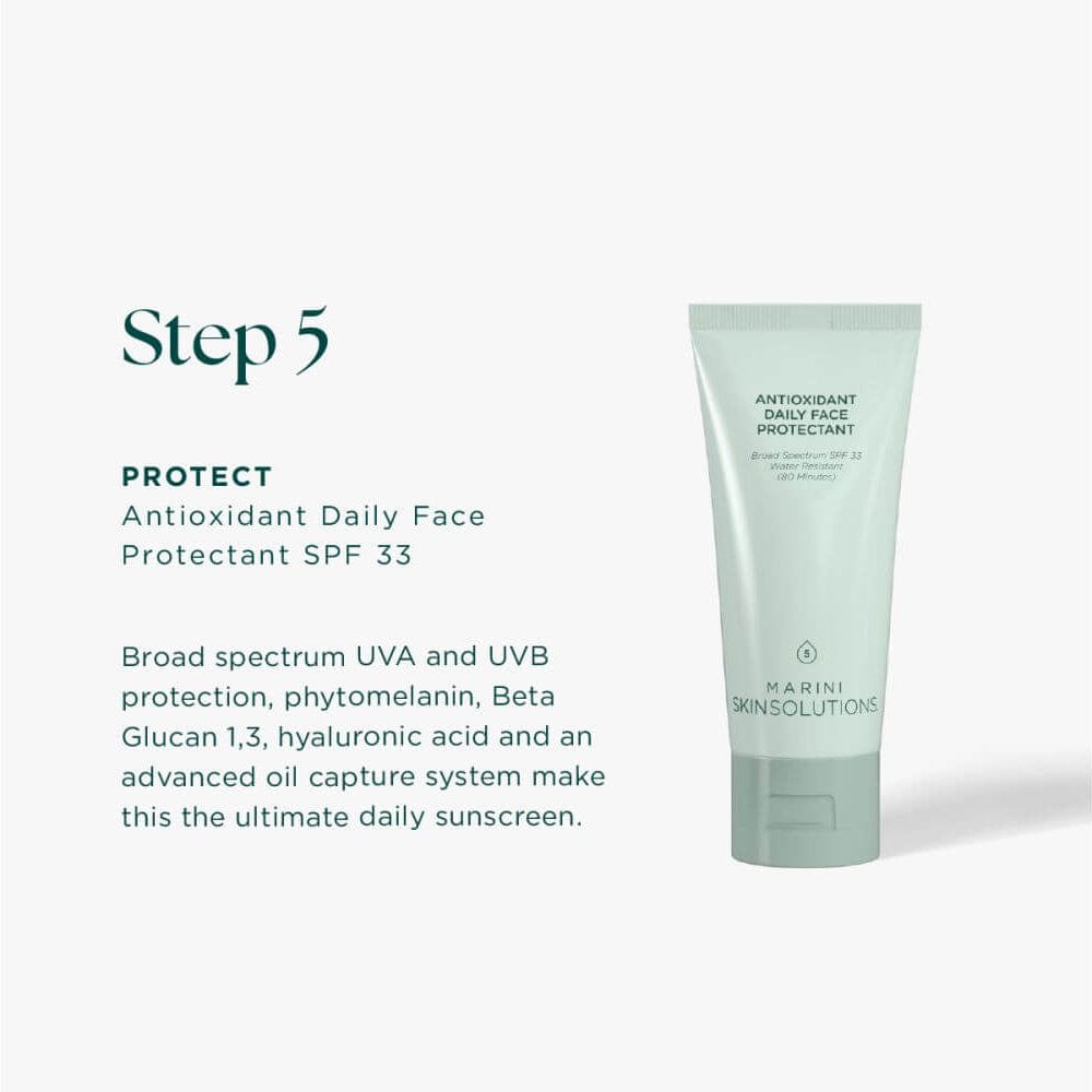 The Marini Skin Solutions Men's Skincare System offers a comprehensive five-step routine designed to enhance skin health. Begin by cleansing and shaving to prepare your skin. Next, apply Bioclear Face Lotion to resurface the skin, which helps minimize fine lines, clear pores, reduce redness, and brighten complexion. Follow with PeptideXtreme to hydrate and soothe the skin while diminishing the appearance of wrinkles. Finally, protect your skin daily with the Antioxidant Daily Face Protectant SPF 33, providing broad-spectrum UVA and UVB defense to maintain skin resilience. This system combines targeted steps to support a refreshed, youthful complexion.