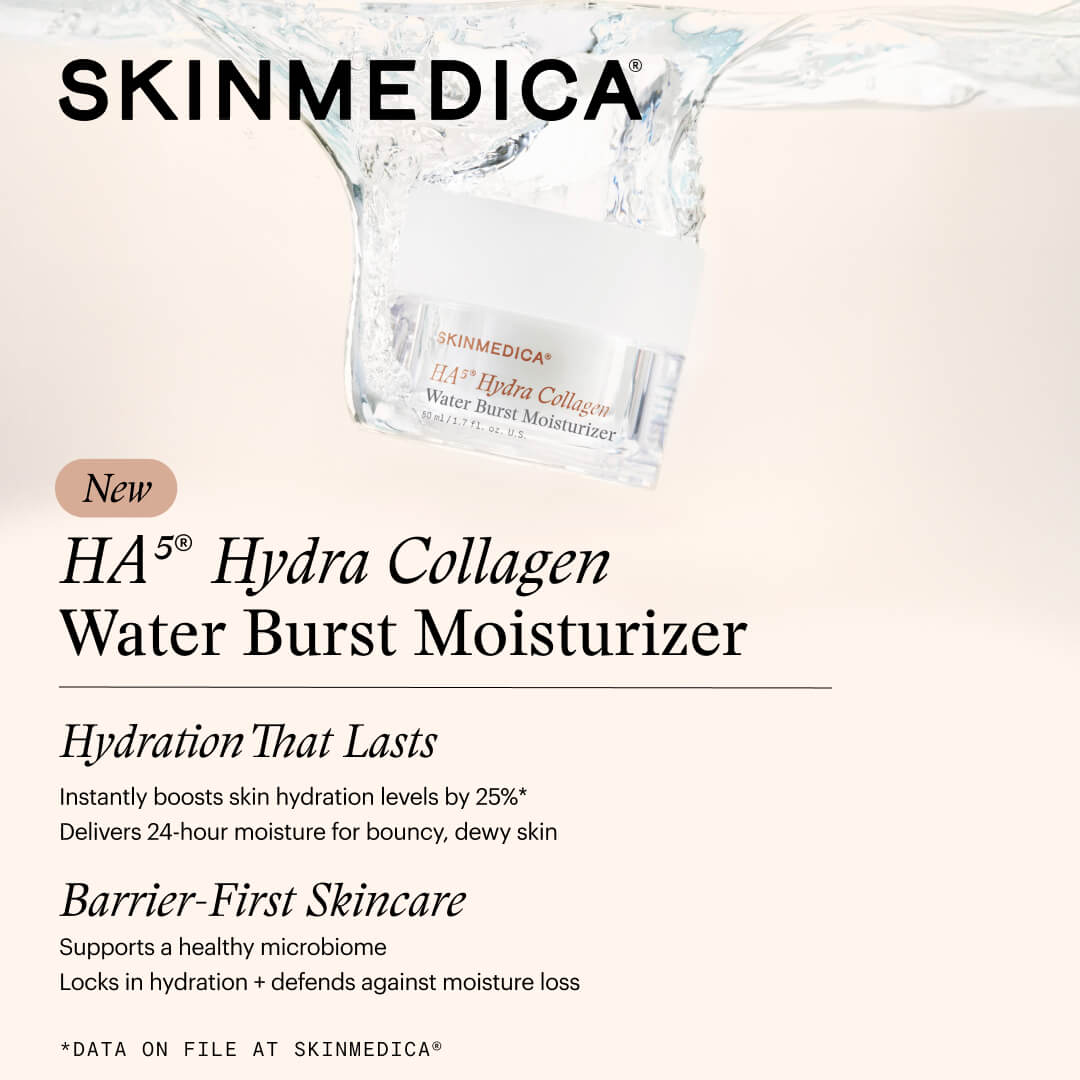 Experience a bursting wave of hydration with SkinMedica’s HA5® Hydra Collagen Water Burst Moisturizer. Powered by the HA5® Hydra Collagen Complex and Microbiome Barrier Complex, this advanced formula instantly quenches, smooths, and supports the skin barrier for a bouncy, radiant complexion.