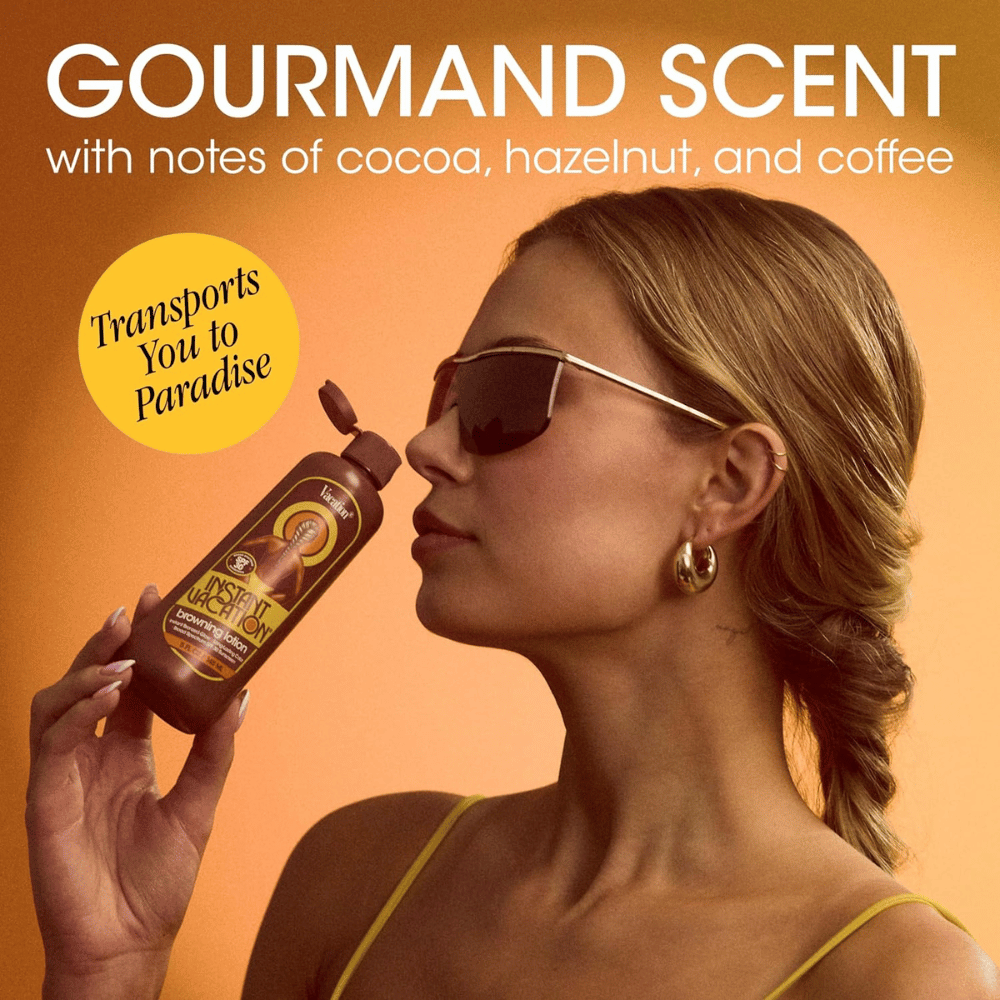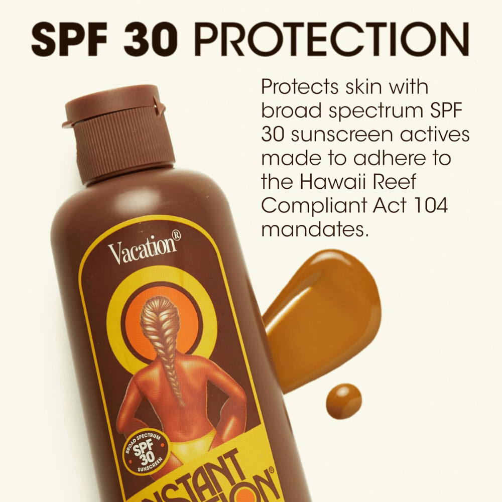 Instant Vacation SPF 30 Browning Lotion by Vacation instantly delivers a bronzed, sun-kissed look while providing SPF 30 protection. This lightweight, moisturizing lotion spreads and absorbs quickly for fast application and easy color layering, while its gourmand scent transports you to paradise.